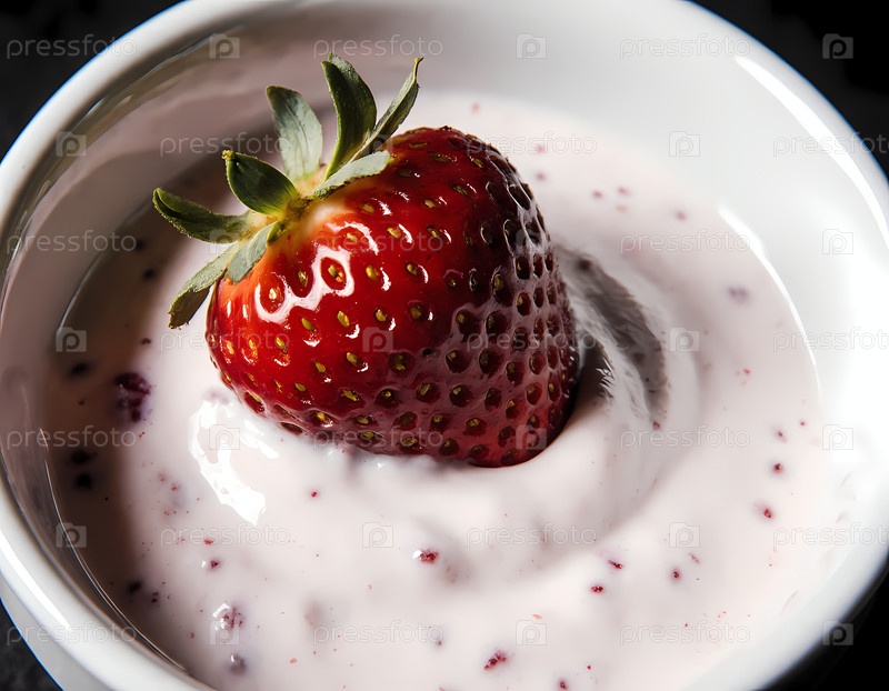 Кремный клубниковый йогурт находится в маленькой миске, на которой стоит яркая спелая клубника, приглашающая насладиться во время уютного обеденного перерыва с друзьями Generative AI
