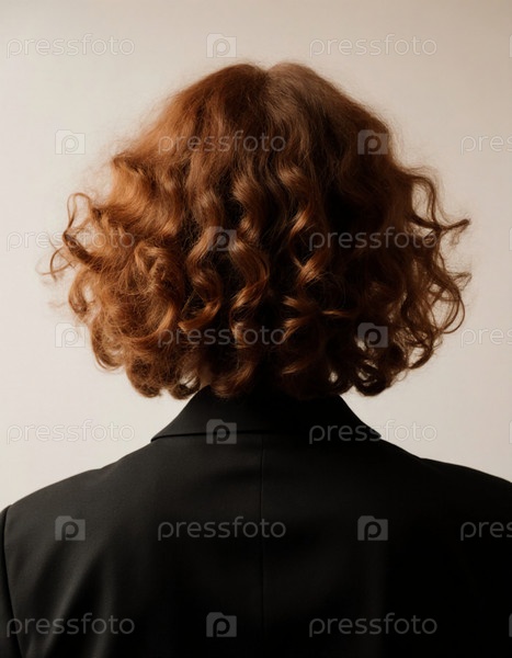 Человек с ярко-красными кудрявыми волосами виден сзади, одетый в гладкий черный наряд Generative AI
