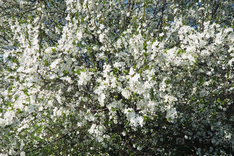 Нежные цветы дикой вишни раскрывают свои лепестки, создавая потрясающий гобелен белого цвета на ярко-зеленой траве