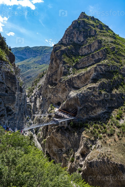 Захватывающий дух пейзаж Сулакского каньона с подвесным мостом и горами