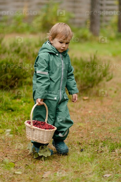 Счастливый малыш, несущий урожай клюквы в осенней природе