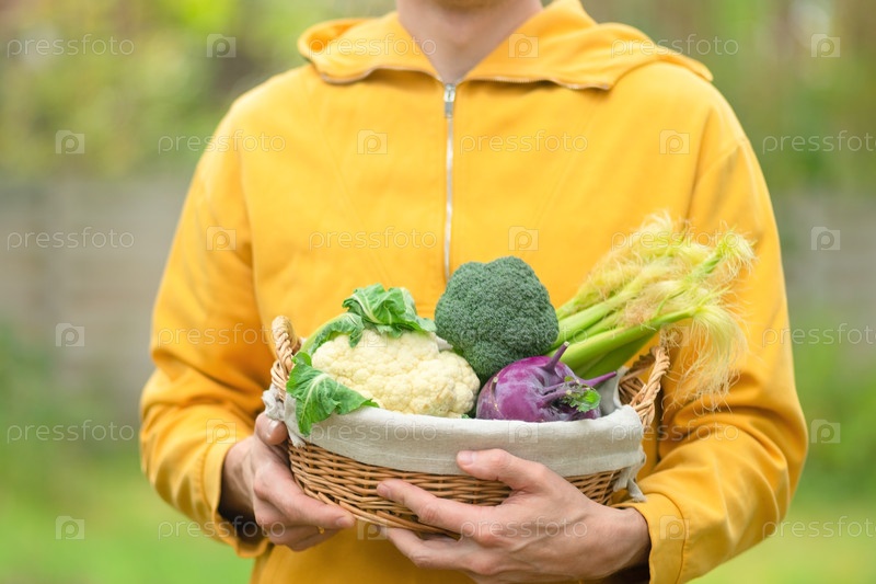 Руки фермера, держащего корзину с органическими овощами от урожая