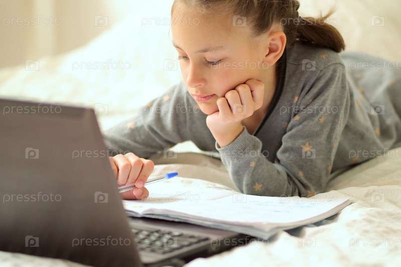 Милый ребенок использует ноутбук для обучения, онлайн-обучение, домашнее обучение.Девушка должна делать уроки на дистанционном обучении.Концепция домашнего обучения
