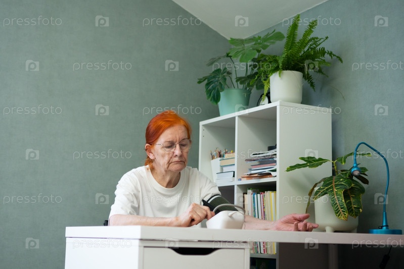 Пожилая женщина ждет за своим столом с грустным, меланхоличным взглядом, ожидая показания своего артериального давления