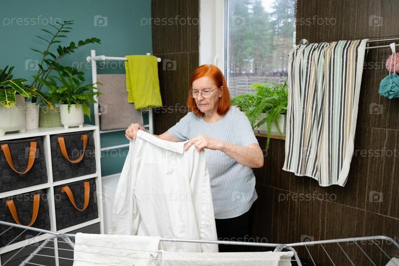 Высокопоставленная женщина вешает белье на металлическую сушилку