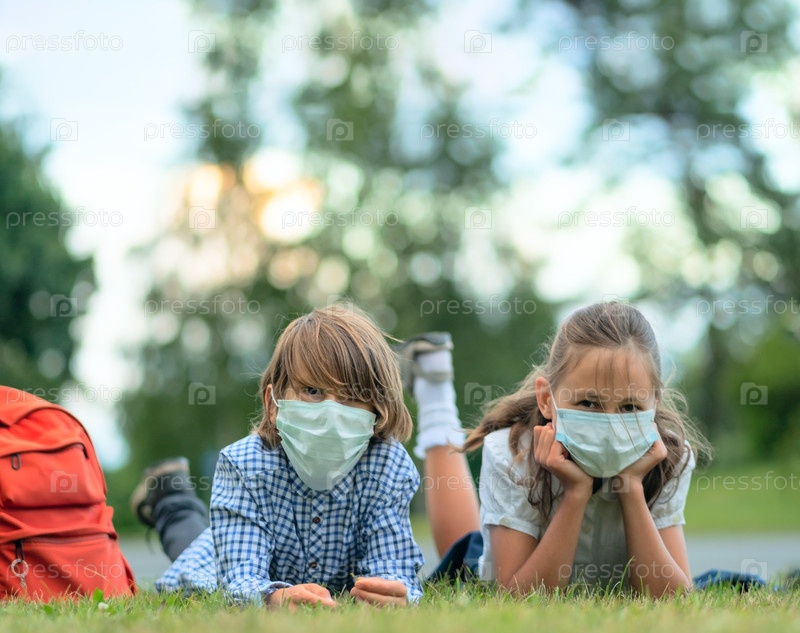 Дети возвращаются в школу. милые ученики с рюкзаками. мальчик и девочка в защитных масках лежат на траве