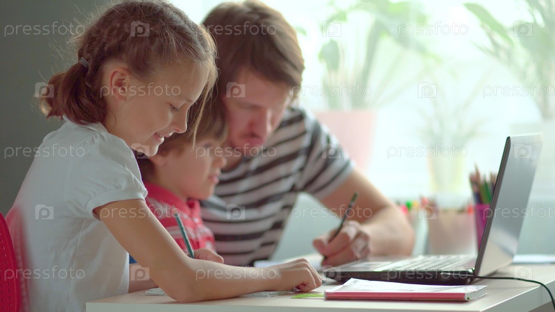 Милые дети используют ноутбук для обучения, онлайн-обучение, домашнее изучение. у мальчика и девочки есть уроки на дистанционном обучении. концепция домашнего обучения