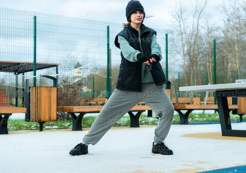 Девушка, выполняющая прокрутки ног для растяжения во время своей повседневной тренировки на открытом воздухе. ежедневная рутина поддержания физического здоровья и мобильности суставов с акцентом на гибкость