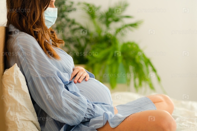 Беременная женщина в маске сидит на кровати, обнимая живот, передавая спокойное и интроспективное настроение