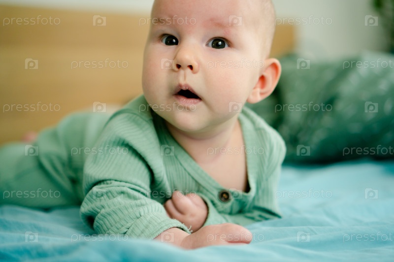 Ребенок в зеленом реберном комбинезоне лежит на синем одеяле, демонстрируя любопытное выражение лица, которое подчеркивает гармонию цветов и комфорт уютной среды