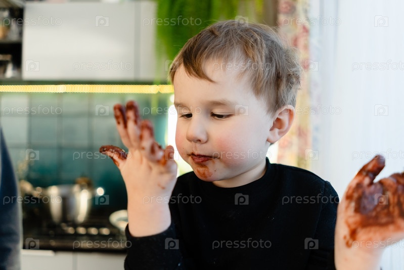 Трехлетний мальчик готовится лизать расплавленный шоколад из ладони. любопытные выражения после употребления сладостей против правил. концепция нездорового детского питания и риск аллергии