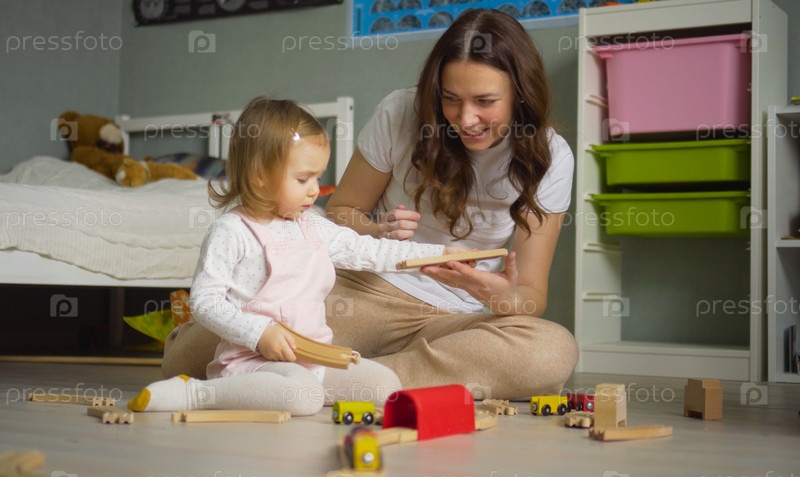 Мать и дочь играют вместе с игрушками в помещении дома.Мама помогает своей девочке.Концепция семейного образа жизни