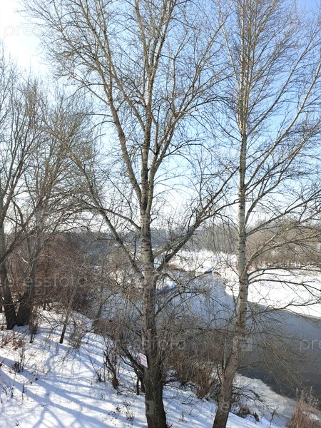 Начало весны, начало марта, таяние снега, деревья вдоль речки, весенний пейзаж