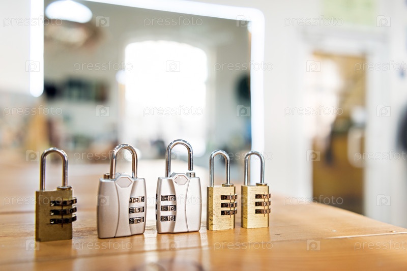 Комбинированные замки стоящие на деревянном столе. Концепция безопасности и защиты. Металлические замки с цифровым кодом для охраны частной собственности, безопасность и решения конфиденциальности данных