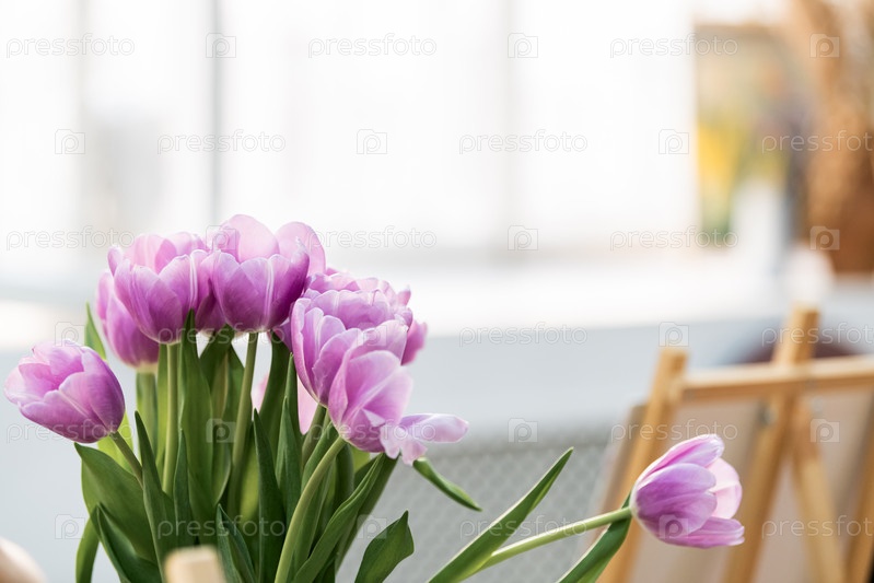 Букет фиолетовых тюльпанов в вазе возле окна.Весенняя цветовая аранжировка во внутреннем интерьере дома. Свежее цветочное украшение для поздравительной открытки, праздничного торжества или концепции дизайна фона