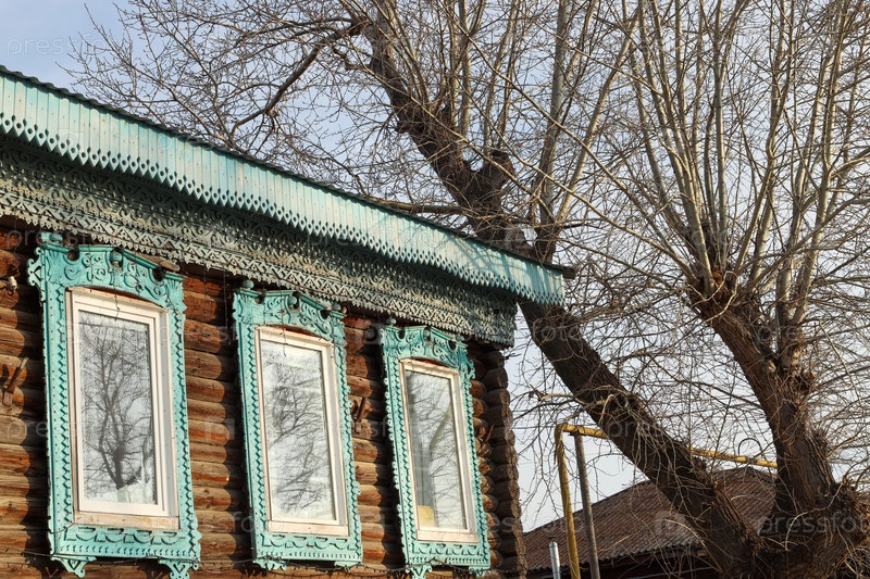 Декоративные элементы старого дома, вырезанные из дерева: оконные рамы и элементы под крышей