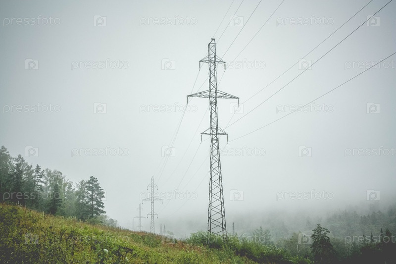 Опоры ЛЭП на туманном холме