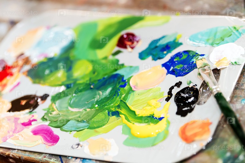 Художественная палитра с красочными масляными красками и кистью. Живописное оборудование для создания изобразительного искусства. Творческое рабочее пространство художника. Инструмент для смешивания цветов в студии. Концепция художественного хобби