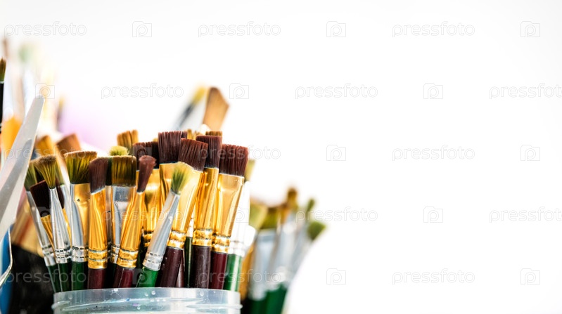 Коллекция художественных кистей и ножей палитры в стеклянных бочках. Инструменты художника для масляной и акриловой живописи на холсте. Творческое семинарное оборудование для художников, любителей и студентов