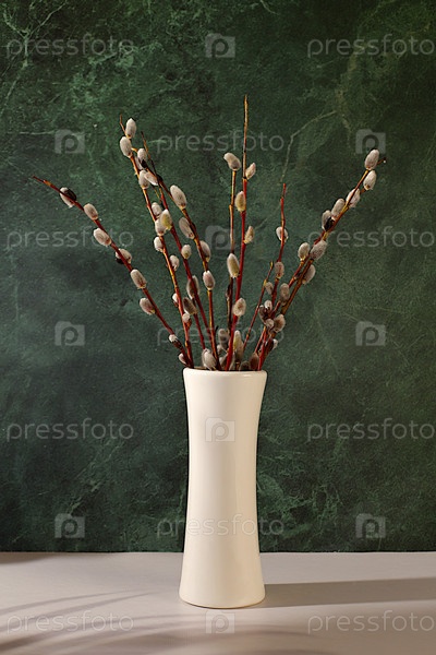 Деликатные ветки ивы в вазе на кухонном столе. концепция Пальмового воскресенья, подготовка к празднованию Пасхи, шаблон дизайна с пространством для текста и праздничного пасхального баннера, домашний интерьерный дизайн, абстрактная весенняя цветовая аран