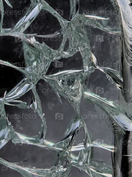 Разбитое стекло с острыми краями и трещинами. Видны осколки и разломы, создающие узор. Фон темный