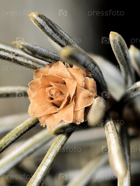 Крупным планом показан цветок светло-коричневого цвета, окруженный тонкими зелеными и серыми иголками, шишка хвойного дерева, формой напоминающая розу. Фон размытый