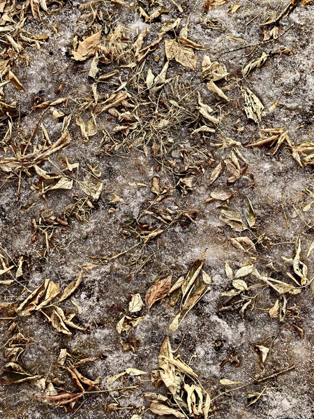 Земля, покрытая сухими листьями и растительными остатками. Листья коричневого цвета разбросаны по поверхности
