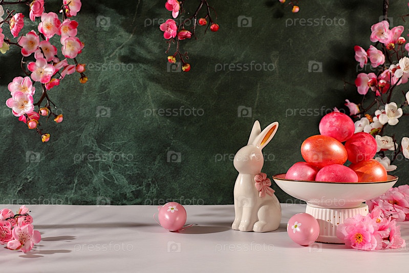 Красивый пасхальный баннер с украшенными яйцами перепелов, ветвями сакуры и вишневых цветов, весенними бабочками и перьями. Концепция "Счастливая Пасха". абстрактная весенняя пасхальная композиция со пространством для текста