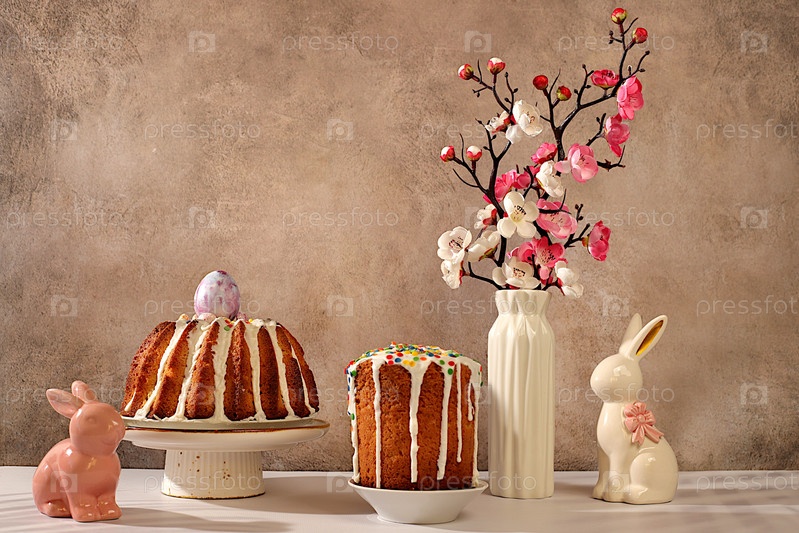 Концепция празднования Пасхи, Традиционный пасхальный торт, фигурки пасхального кролика и ветви вишневых цветов в вазе на элегантном кухонном фоне, идеи пасхальных блюд для домашней кухни, шаблон дизайна