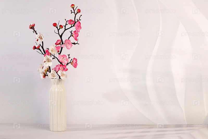 Элегантный солнечный красочный баннер с розовыми цветущими веточками сакуры в вазе, абстрактная весенняя цветовая аранжировка и шаблон для вашей творческой работы, дисплейный стол и концепция весны, дизайн праздничной кухни