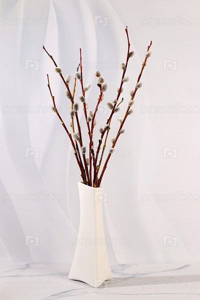 Деликатные ветки ивы в вазе на элегантном кухонном столе, абстрактная весенняя цветовая аранжировка. Пасхальная открытка и натюрморты, минималистическая концепция праздника и праздничный пасхальный баннер, дизайн интерьера дома