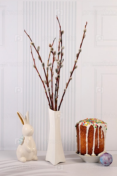 Традиционный пасхальный торт, фигурки пасхального кролика и пушистые ветви ивы в вазе на элегантном кухонном фоне, концепция празднования Пасхи, идеи пасхальных блюд для домашней кухни, шаблон дизайна с пространством для текста, баннер экрана