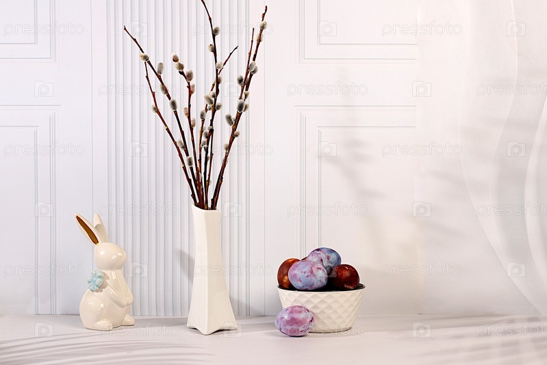 Концепция празднования Пасхи, окрашенные яйца, фигурки пасхального кролика и пушистые ветви ивы в вазе на элегантном кухонном фоне, идеи пасхальных блюд для домашней кухни, шаблон дизайна