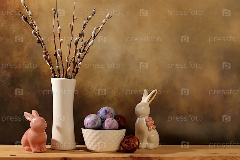 Концепция празднования Пасхи, окрашенные яйца, фигурки пасхального кролика и пушистые ветви ивы в вазе на элегантном кухонном фоне, идеи пасхальных блюд для домашней кухни, шаблон дизайна