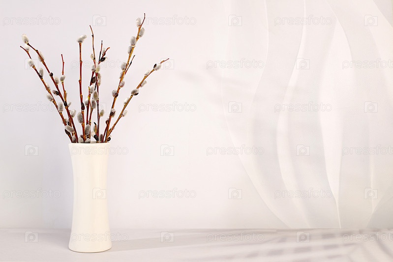 Деликатные ветки ивы в вазе на элегантном кухонном столе, абстрактная весенняя цветовая аранжировка.Пасхальная открытка и натюрморты, минималистическая концепция праздника и праздничный пасхальный баннер, дизайн интерьера дома