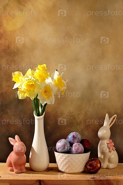 Концепция празднования Пасхи, окрашенные яйца, фигурки пасхального кролика и весенние нарциссы в вазе элегантный кухонный фон, идеи пасхальных блюд для домашнего приготовления пищи, шаблон дизайна с пространством для текста