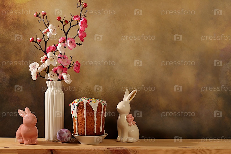 Традиционный пасхальный торт, фигурки пасхального кролика и ветви вишневых цветов в вазе на элегантном кухонном фоне, концепция празднования Пасхи, идеи пасхальных блюд для домашней кухни, шаблон дизайна