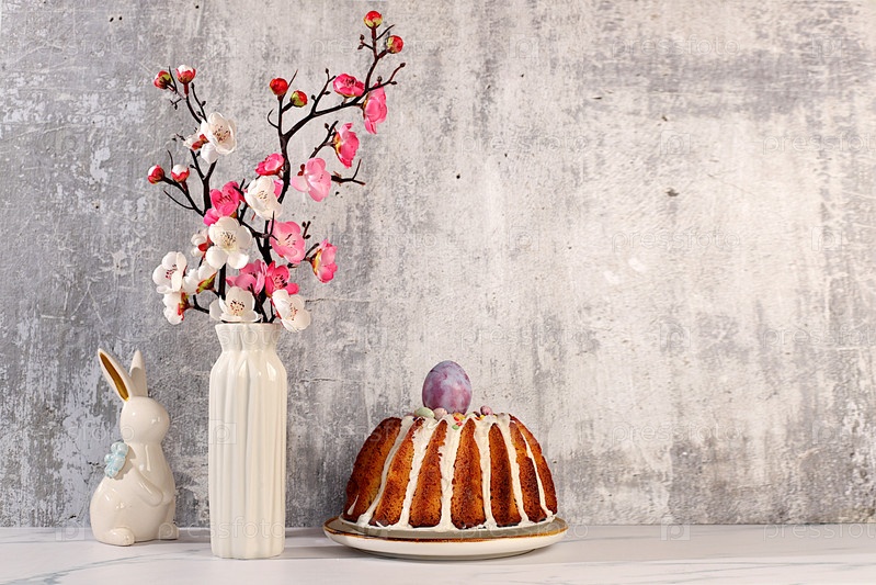 Традиционный пасхальный торт, фигурки пасхального кролика и ветви вишневых цветов в вазе на элегантном кухонном фоне, концепция празднования Пасхи, идеи пасхальных блюд для домашней кухни, шаблон дизайна с пространством для текста, баннер экрана