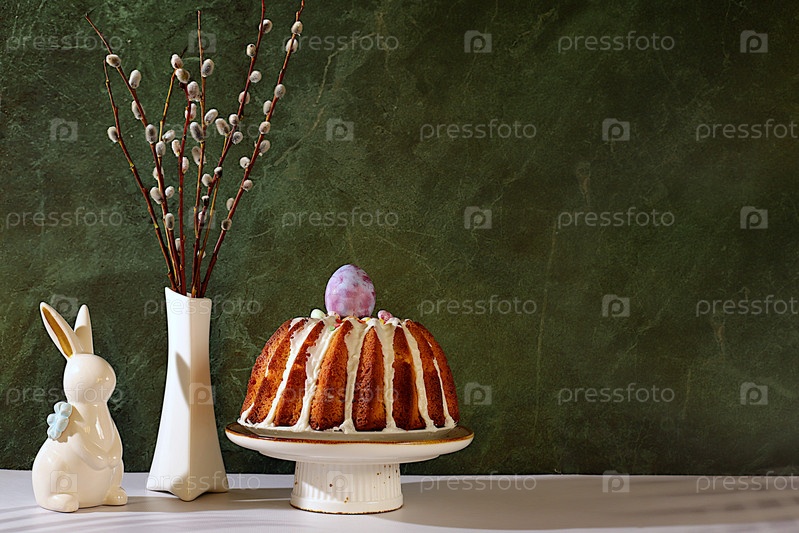 Традиционный пасхальный торт, фигурки пасхального кролика и пушистые ветви ивы в вазе на элегантном кухонном фоне, концепция празднования Пасхи, идеи пасхальных блюд для домашней кухни, шаблон дизайна с пространством для текста, баннер экрана