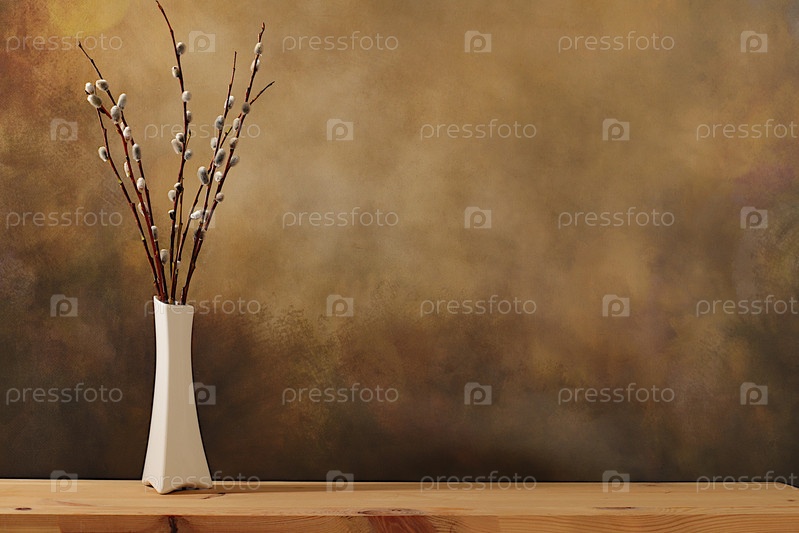 Деликатные ветки ивы в вазе на элегантном кухонном столе, абстрактная весенняя цветовая аранжировка.Пасхальная открытка и натюрморты, минималистическая концепция праздника и праздничный пасхальный баннер, дизайн интерьера дома