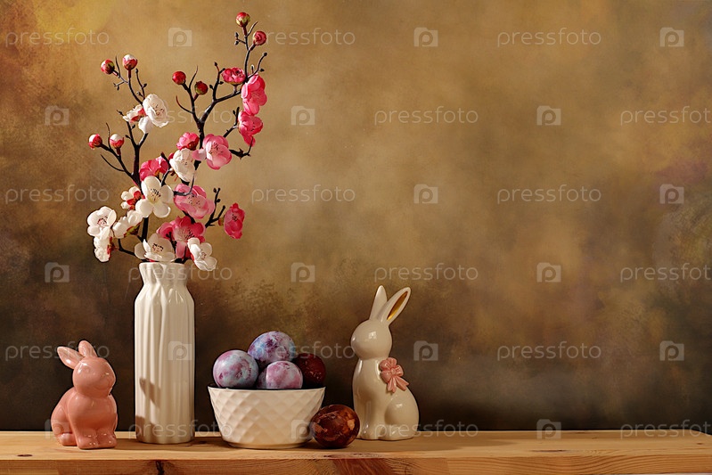Концепция празднования Пасхи, окрашенные яйца, фигурки пасхального кролика и ветви вишневых цветов в вазе на элегантном кухонном фоне, идеи пасхальных блюд для домашнего приготовления пищи, шаблон дизайна с пространством для текста, баннер экрана