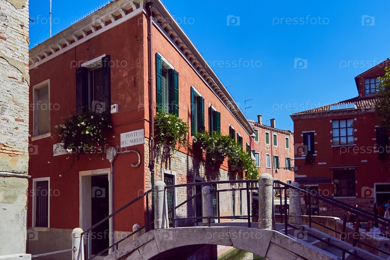 Фрагмент живописной улицы Венеции с мостом Понте дель Скуэро, перекинутым через узкий канал