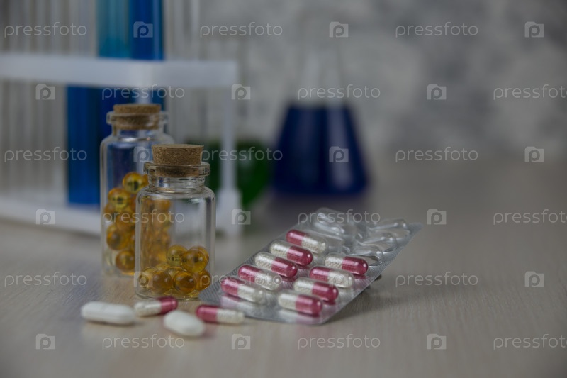 Лекарства на лабораторном столе.Таблетки и капсулы в стеклянных бутылках и блистере на лабораторном столе