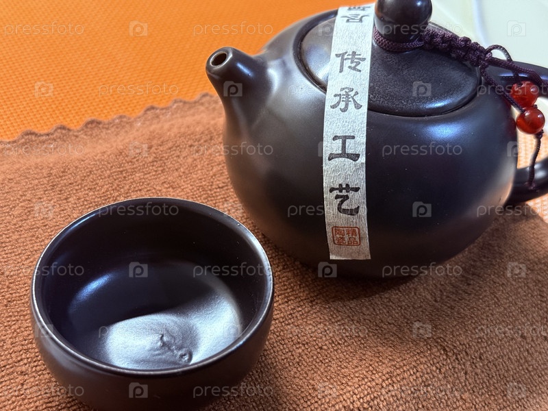 Традиционный китайский чайник и чашка из черной керамики на текстурной ткани