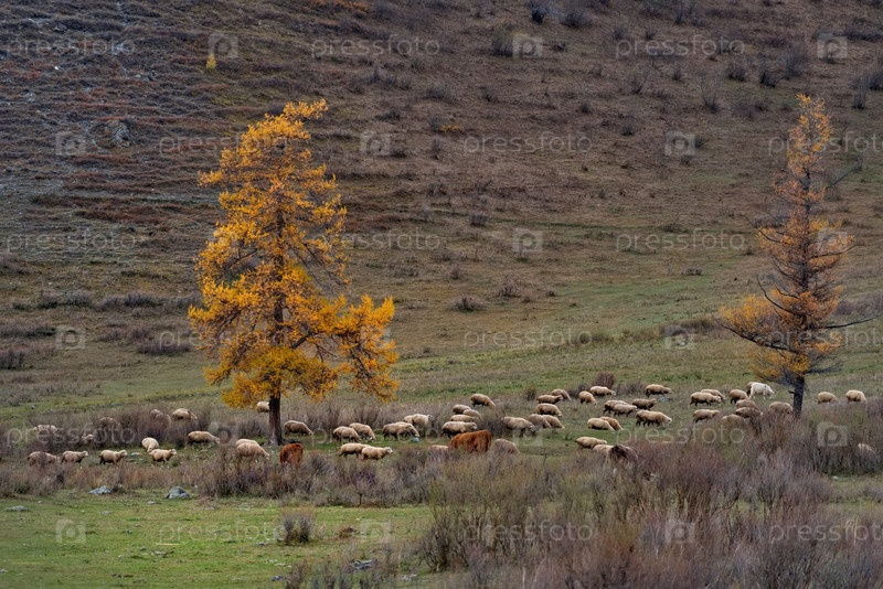 Россия. Юг Западной Сибири, Горный Алтай. Отары овец пасутся на осенних склонах гор в долине реки Катунь недалеко от села Инегень