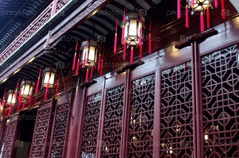 Вырезанный фасад традиционного китайского здания с фонарями