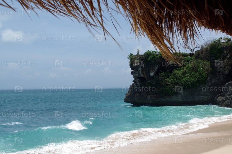 Вид с сена, покрытого навесом с видом на пляж, океан, волны и скалы, Бали, Индонезия