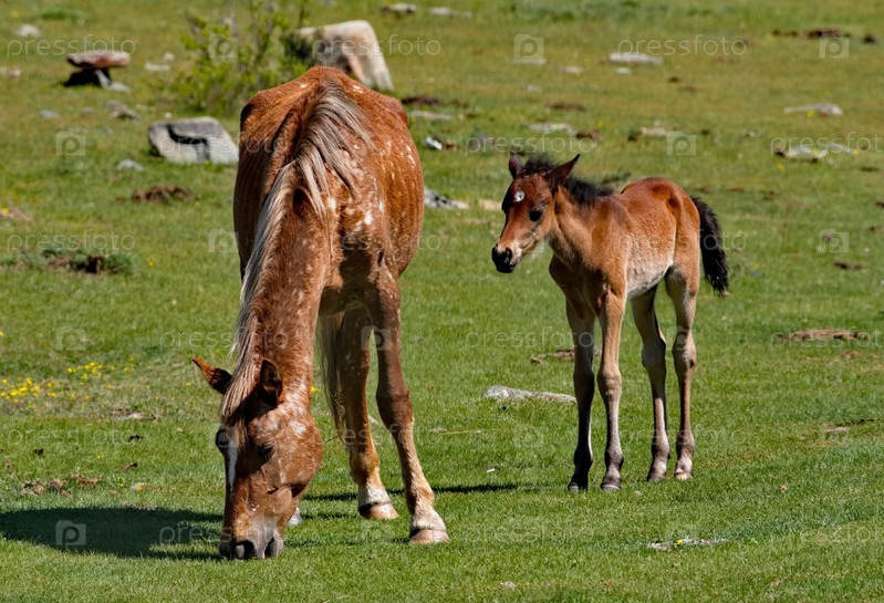 Россия. горный Алтай. Мирно пасущаяся лошадь с жеребенком в весенних горных степях вдоль Чуйского тракта