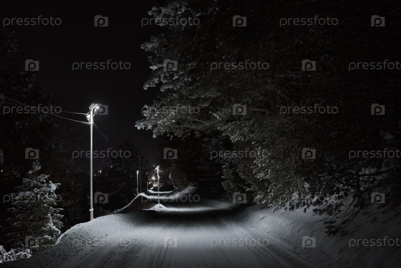 Россия, Артыбаш, Горный Алтай. Ночная автодорога вдоль берега Телецкого озера освещенная светом уличных фонарей
