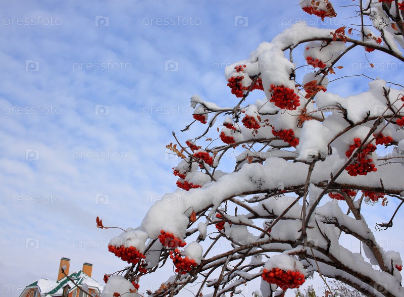 Ветка рябины с ягодами покрытая снегом